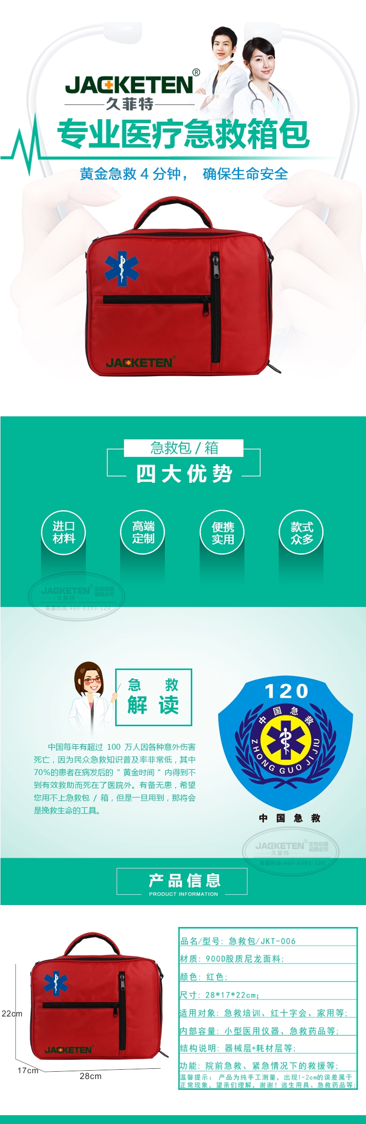 品名/货号:急救包/JKT-006;材质:900D股质尼龙面料;颜色:红色;尺寸:28*17*22cm;适用对象:急救培训、红十字会、家用等;内部容量:小型医用仪器、急救药品等;结构说明:器械层+耗材层;功能:院前急救、紧急情况下的救援等