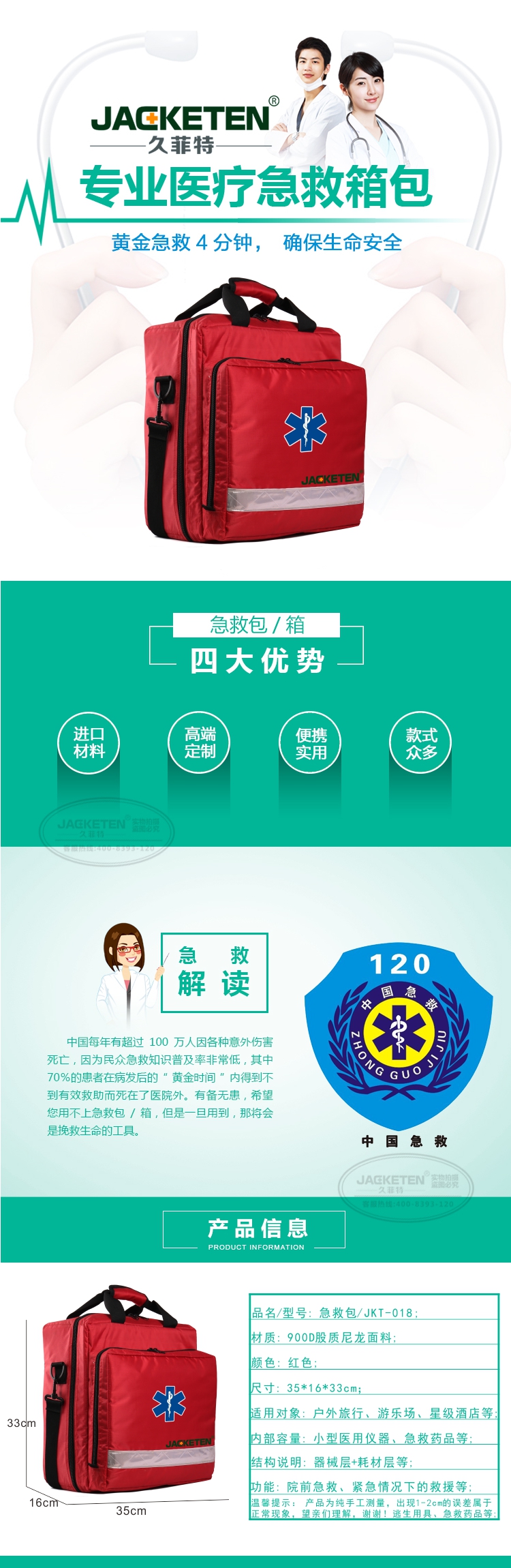 品名/货号:急救包/JKT-018;材质:900D股质尼龙面料;颜色:红色;尺寸:35*16*33cm;适用对象:户外旅行、游乐场、星级酒店等;内部容量:小型医用仪器、急救药品等;结构说明:器械层+耗材层;功能:院前急救、紧急情况下的救援等