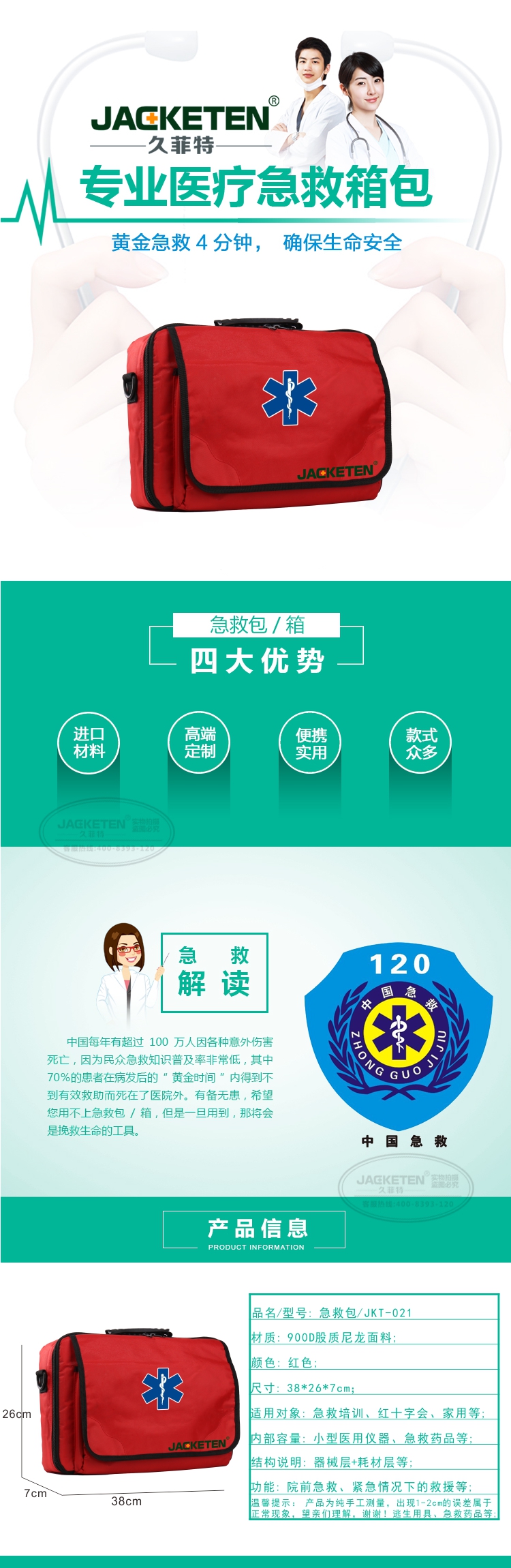 品名/货号:急救包/JKT-021;材质:900D股质尼龙面料;颜色:红色;尺寸:33*26*7cm;适用对象:急救培训、红十字会、家用等;内部容量:小型医用仪器、急救药品等;结构说明:器械层+耗材层;功能:院前急救、紧急情况下的救援等